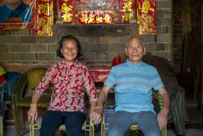 我们继续走访拍摄,在一户家中,阳光斜斜洒进家中,两个藤椅紧紧挨在一块。爷爷坐在左手边,腰板挺得笔直,仿佛要把几十年的精气神都凝在这一刻;奶奶坐在右手边,手指悄悄拽一下衣角,又理了理鬓角的银发。收拾好的那一刻,爷爷奶奶自然的双手交叠胜却人间无数。“好,爷爷奶奶笑一个!”摄影师半蹲着构图,快门按下的瞬间,爷爷嘴角微微上扬,奶奶眉眼笑出月牙。