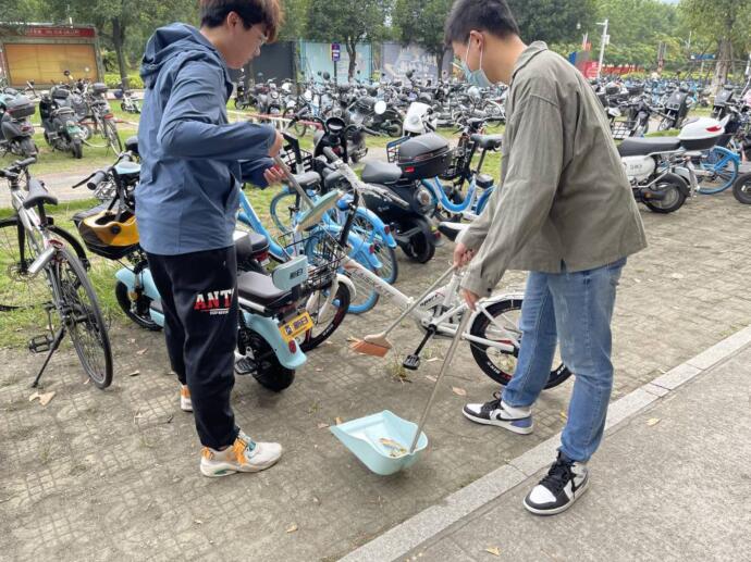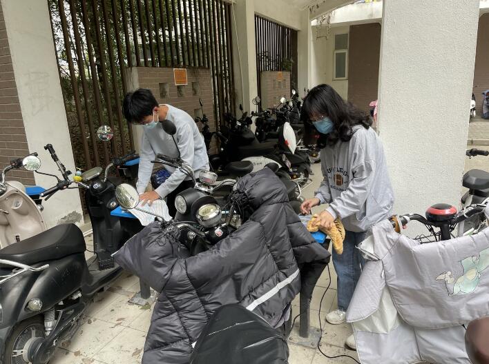 首先,团支部成员们于西3教学楼集合,用扫把打扫教学区堆积的落叶,为“美丽校园”贡献自身力量。接着,团支部成员佩戴绶带,沿着教学区内外周围路线,巡视并捡起道路上的垃圾,同时制止校园内不文明的现象。最后,团支部成员前往宿舍区,将宿舍区乱停放的车辆放置到规范区域,同时把宿舍楼许久未擦的电动车桩进行擦洗。
