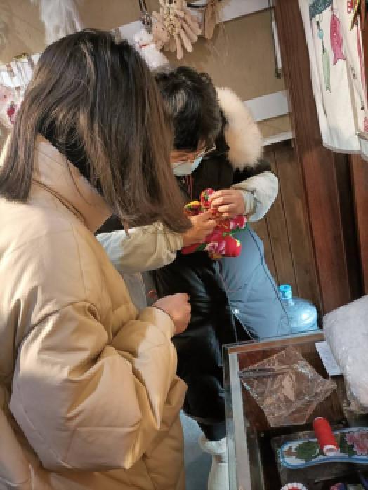 但队员们在观察的过程中,发现工坊内鞋垫展品并不多,徐老师解释道随着近些年鞋垫的应用性下降,心灵手巧的手工艺人便创新性的将割花技艺应用于其他物品上。千缕丝线被银白色的绣花针编织成了象征强壮的布老虎、代表平安喜乐的平安锁、寓意马到成功的小马摆件等,成本会大大降低,但消费市场较大,愿意购买的人越来越多。如今,割花不但成为五莲传统文化的标志性符号,而且通过开发割花这一手工艺品,带动了一大批农村妇女从事割花制作,既增加了农民收入,助力脱贫致富,又带动了邻里和睦,促进了乡村振兴。队员们惊叹于割绣手工艺品做工精细、作品精美,纷纷挑选购买喜爱的工艺品。