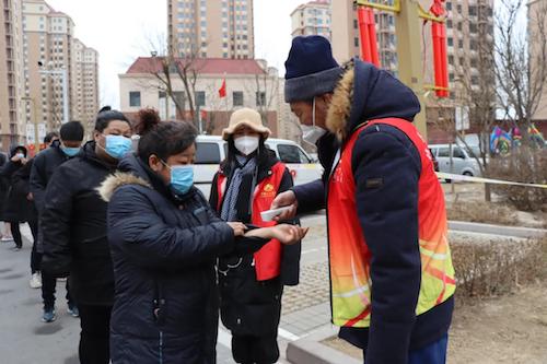 各检测点在接到核酸筛查命令后,连夜组织工作人员进行各项准备工作,“红马甲”也成为寒冬抗疫温暖人心的力量,志愿者们有序组织排队人群,积极维护排队秩序,使整个采样过程既流畅又高效。第二轮筛查仍然以楼栋为单位,一名工作人员带领一位志愿者按照排队的进度、挨家挨户通知村民下楼检测,全力实现“村民等候时间最短,检测现场排队人数最少”。村民下楼后,由带队志愿者划分为10人一组,全程跟随至信息核对登记处,抗疫小队队员在现场担任登记的工作同时,抗疫小队队员在检测点队伍旁维持着秩序,不断提醒村民带好口罩、携带身份证、站“红线”(间隔距离一米)。保障现场秩序井然、不聚集、不混乱,也提高了大筛的工作效率。