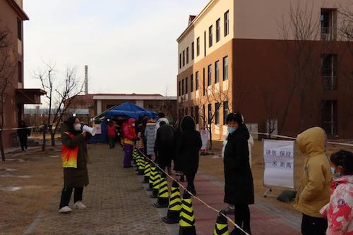 抗疫小队队员在检测点队伍旁维持着秩序。整个过程人们都很积极,听从指挥,按照地上红色的油漆标志间隔一米,严格遵守全程佩戴口罩,徐徐前进。为村民进行采样的医务人员为了村民们能少在寒风中等待,两名医务人员共同上阵,开通两条采样通道,极大地加快了筛查的速度。“大冷天的,排队时间能再缩短点吗?”“这招儿行啊,咱拿着身份证就行,嘛都不用扫,他扫咱们。”“好么,队伍一直在动,介我还带了小板凳呢,照介意思,一会儿就能回家了!”在排队的人群中,大家探出头确认前方情况,不时发出这样的感叹。