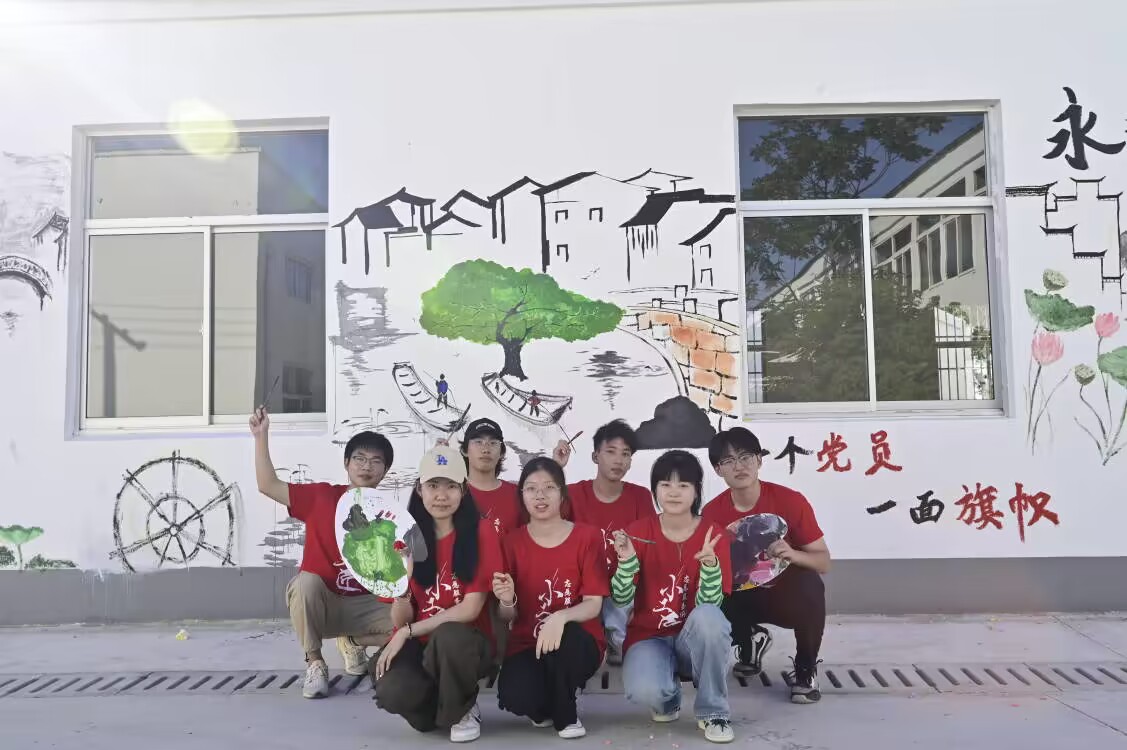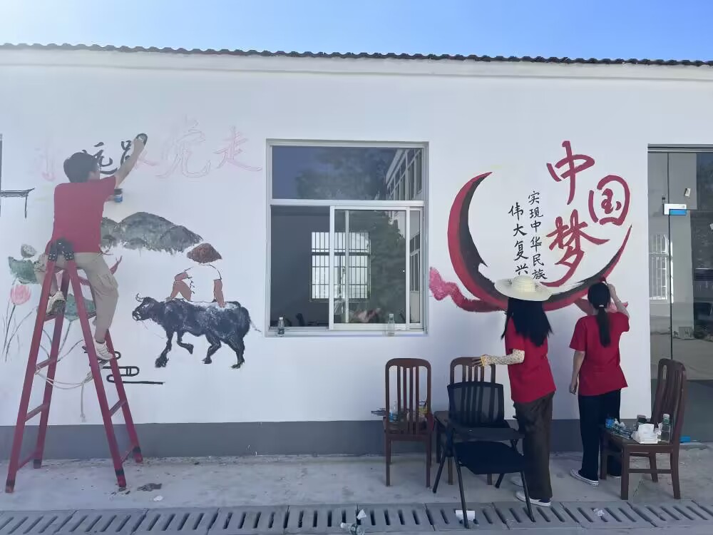 实践团队成员在田间地头通过实地考察了解认知乡村,调研美丽乡村建设成果。在调研的间隙,社会实践团围绕乡村新貌,用巧手匠心定向设计,聚焦“中国梦”、“乡村振兴”和“乡村自然风光”三个主题进行墙绘绘画。本次墙绘融入党建文化元素和陈店村风貌,寓意着陈店村民在党的带领下开拓进取,坚决贯彻落实习近平总书记关于“绿水青山就是金山银山”的发展理念,共同为美丽江苏建设贡献力量。