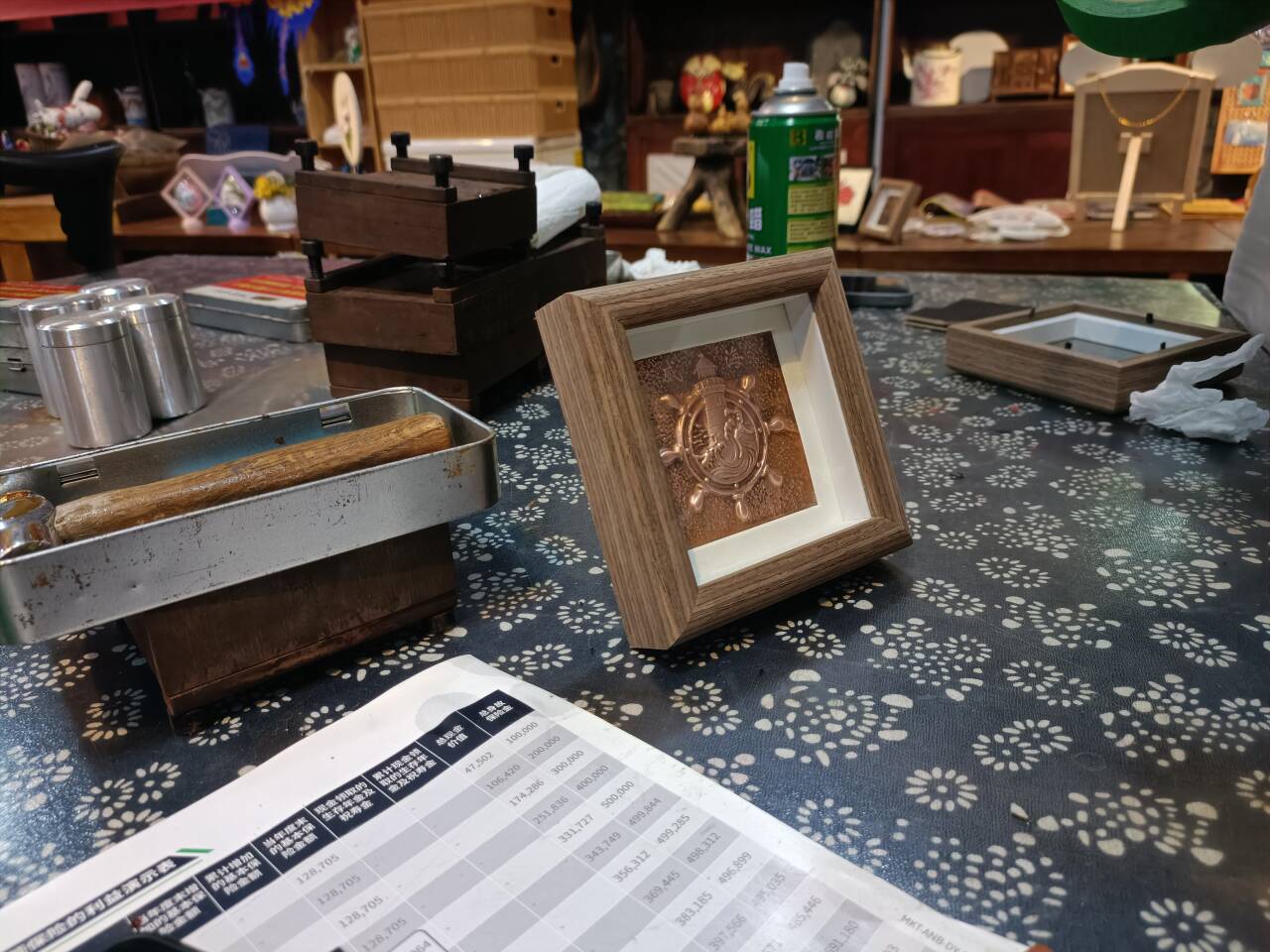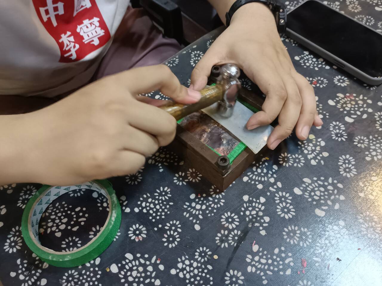 团队成员亲自体验了铜版画的制作过程。首先是准备铜版,这一过程需要精确地打磨和抛光,使得铜版表面达到理想的平整度。然后,使用胶带将铜板固定在铁砧上,并用锤子垫在胶条上捶打。这一步骤的精度和技巧性十分具有挑战性,每一次捶打都需要细致入微的控制力和对艺术的把控度。接下来是抛光环节,团队成员学习了如何在铜版上进行抛光,并在铜板上打蜡。每一次抛光都要求准确的力度和一定的耐心,以确保最终做出高质量的作品。
