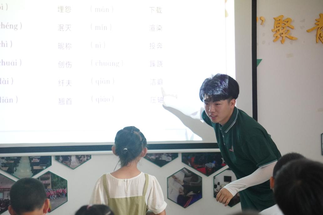 服务队成员贾已铭将绕口令、易错字等小游戏加入课堂中,营造轻松氛围,孩子们积极参与,锻炼口语表达和识别纠正易错字,感受语言韵律,加深对汉字发音理解。课程与游戏结合的方式,激发孩子学普通话的兴趣和热情,让他们在欢乐中学习进步,提高普通话水平,增强自信心和表达能力。