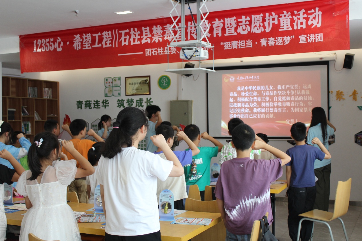 重庆外语外事学院“挺膺担当,青春逐梦”习近平新时代中国特色社会主义思想宣讲团联合重庆市石柱县团委以及石柱县禁毒办,举办“12355心·希望工程|石柱县禁毒宣传教育暨志愿护童活动”。此次宣讲活动旨在帮助青少年了解毒品的危害,提高他们的防范意识,增强其抵制毒品的能力,同时引导小朋友们树立正确积极的人生价值观,让他们从小产生远离毒品意识,在健康环境下成长。