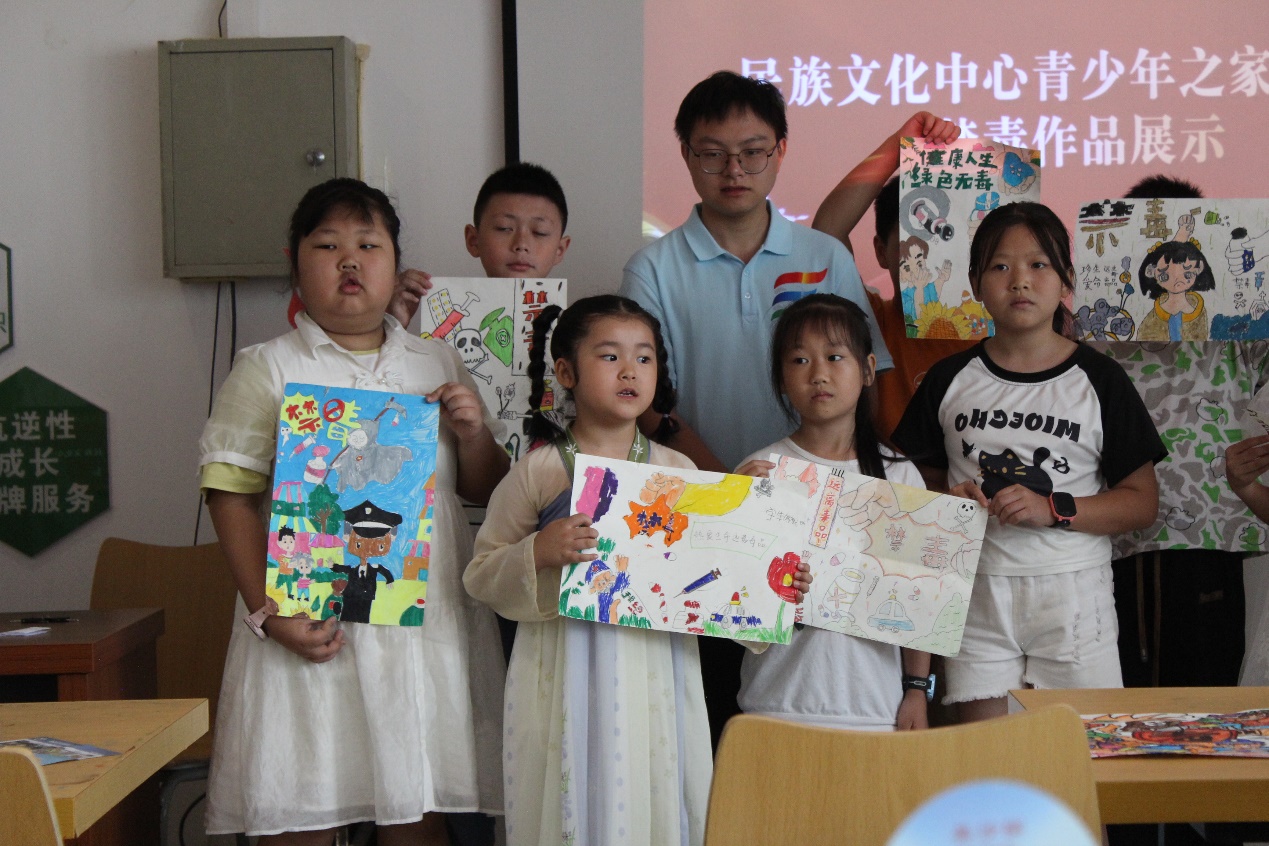 图为青年之家小朋友们展示自己的禁毒主题绘画作品 但欣玥 供图