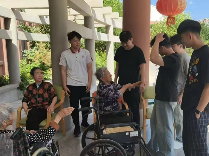 实践团成员不仅在食堂忙碌,还在社区活动区域展现了身影。一位老人坐在轮椅上,周围围着几名学生,他们轻声交谈,脸上洋溢着笑容。老人伸出手,讲述着过往的趣事,学生们专注聆听,偶尔点头回应。