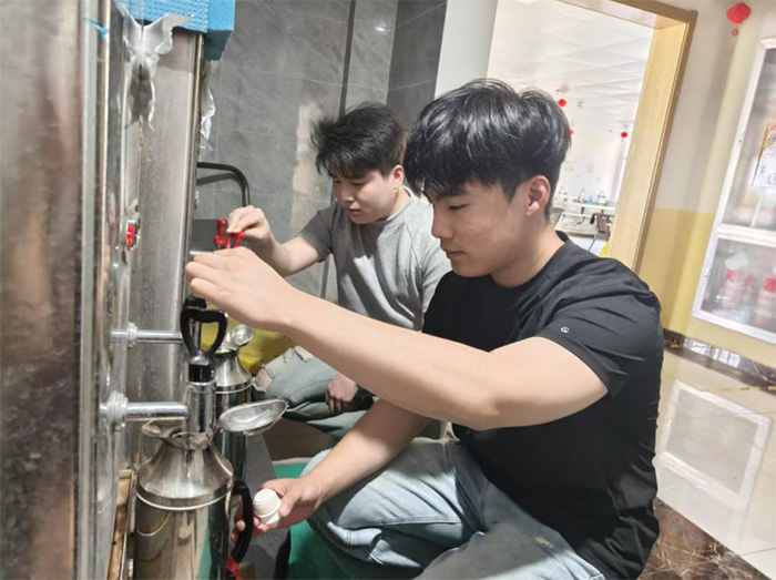 图为“欢乐在乡”实践团成员为行动不便的老人打水