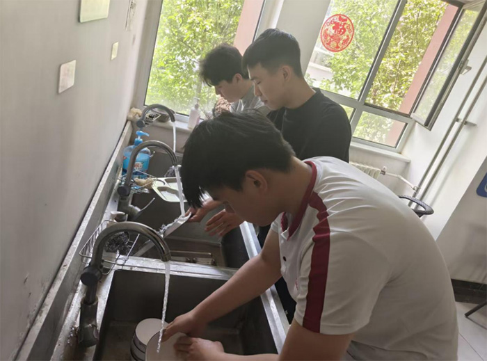 活动过程中,学生们分工明确,有人负责清洁地板,有人擦拭桌椅,还有人整理室内的装饰物。食堂里,水槽边的皂液瓶被频繁使用,空气中弥漫着淡淡的清洁剂气味。