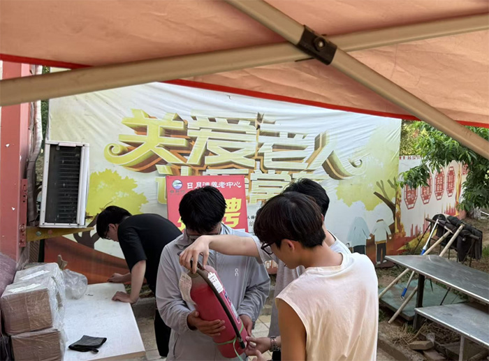 在另一处活动点,几位成员围在一具干粉灭火器旁,认真学习如何检查灭火器压力值、是否过期及喷嘴是否畅通。他们还在工作人员指导下进行简单操作演练,为养老中心消防安全出一份力。