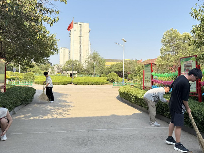 随后,实践团又集中力量对养老中心外围道路、绿化带等公共区域进行了清扫。烈日之下,成员们挥动扫帚,清除落叶与塑料杂物,并将整理出的废弃物再次分类回收。经过整治的小道整洁如新,休息区座椅一尘不染,老人们在清新的环境中休憩时,脸上多了几分惬意。