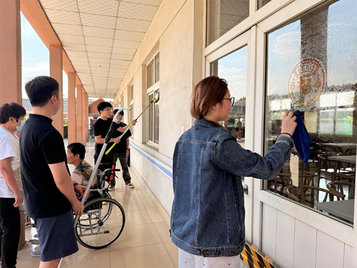 在服务中,青年们也积极参与敬老院的卫生清洁任务。有人手持抹布清洁窗户玻璃,有人操作伸缩杆擦拭高处玻璃。在阳光照耀下,汗水和玻璃上的水珠交织成一道特殊的风景线。他们的动作虽朴实,却让周围老人和工作人员频频侧目,对这群肯干事、愿贴心的年轻人报以赞许。