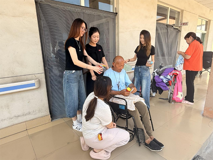 除精神慰藉外,实践团还注重对老人日常生活的细致照顾。在室外,几名成员为坐在轮椅上的老人送去饮品和小零食,并耐心协助其分辨包装上的标签。另一名成员则蹲身与老人平视交谈,努力拉近彼此距离。老人一边接过物品,一边脸上泛起笑容,神情中满是信任与感动。