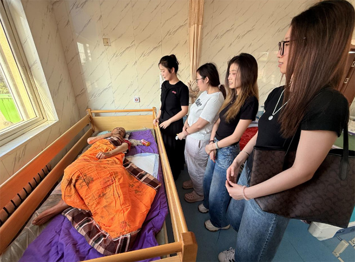 面对行动不便、卧床休养的老人,实践团成员也未缺席。她们分组走访不同病房,与老人们耐心交流,关心询问身体状况。有位老人躺在病床上盖着橙色毛毯,面容略显疲惫,但当几位年轻人站在床边微笑问候时,眼神中显现出一丝安心与依赖。此类探访虽短,却在安静中传递出深深的尊重与陪伴。