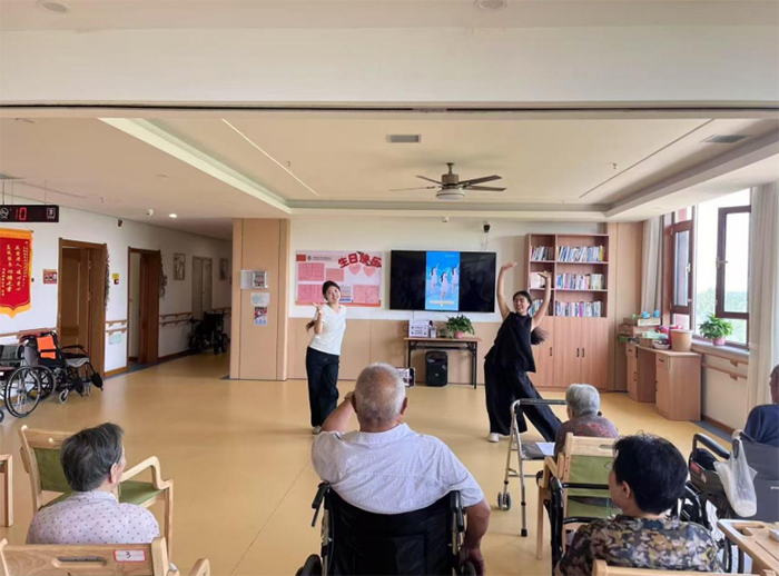 除了日常服务和陪伴活动,实践团还精心准备了一场简单却充满诚意的文艺表演。成员们带来了合唱、舞蹈、朗诵等节目,并邀请老人们一同参与,现场掌声笑声不断,气氛温馨欢乐。一位坐在轮椅上的老人主动上前合唱,周围的志愿者们为他打节奏,营造出互动十足的舞台氛围。