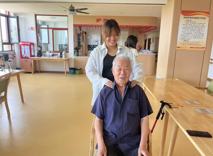 室内护理活动同样有条不紊地进行着。一名实践团成员正在为坐在轮椅上的老人进行肩颈按摩,老人脸上洋溢着放松的笑容。与此同时,另一组成员则主动与老年人进行互动交流,耐心聆听他们的故事。在餐厅和活动室,一些学生围坐在老人身边,为他们介绍健康饮食和日常保健小知识,帮助他们在精神层面也感受到关怀。