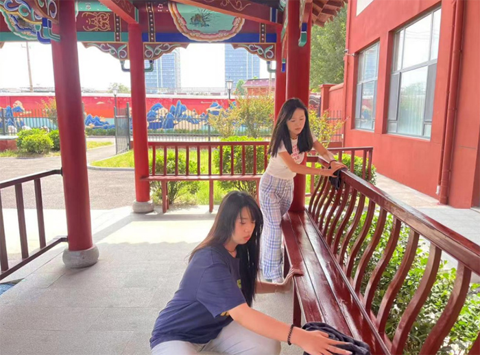 活动伊始,实践团成员们分组开展清洁卫生工作。在养老中心的凉亭下,两名学生正认真地擦拭木质长椅,每一个栏杆和角落都不放过。尽管天气炎热,她们依旧神情专注,力求为老人们提供一个干净整洁的休息环境。有人在室外细致打扫,有人则深入室内开展服务,整个养老院内外一片井然有序,充满温情。