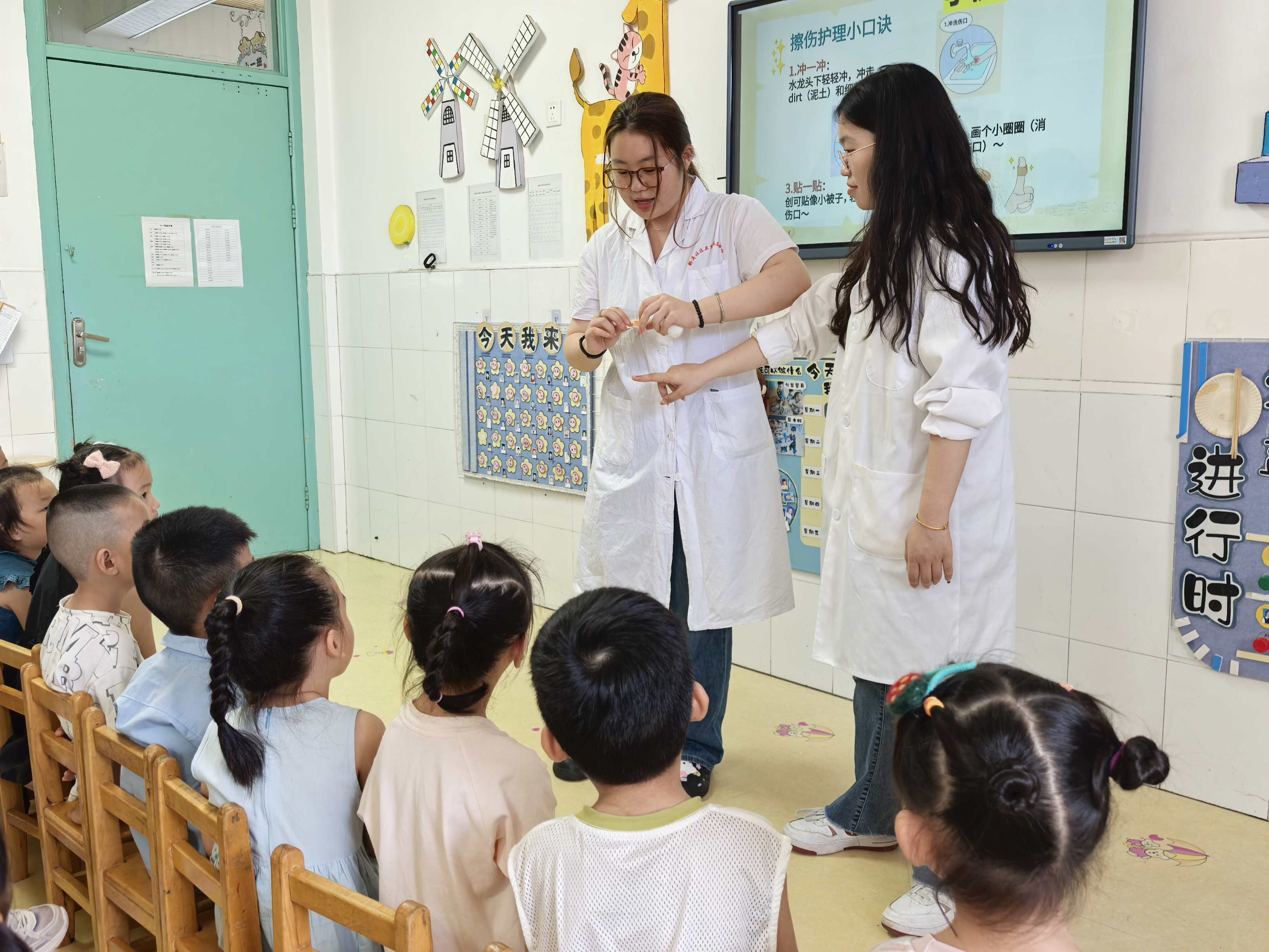 夏日炎炎,暖意融融。7月19日至8月2日,南通大学杏林学院“七彩梦”志愿服务团走进盐城市盐湾幼儿园,为小朋友们带来生动有趣的健康宣讲活动。围绕“伤口包扎小技巧”“护牙健齿我能行”“洗手习惯要养成”三大主题,志愿者们以符合幼儿认知特点的方式,将实用健康知识融入互动体验,帮助孩子们在轻松氛围中树立健康意识。
