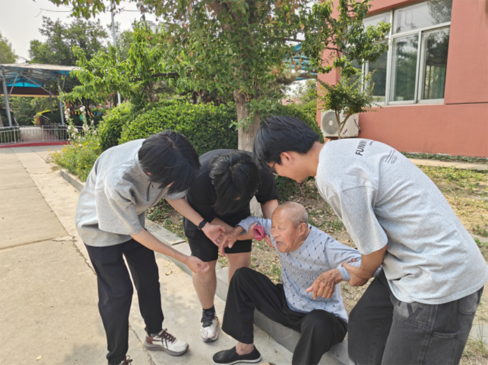 在日常交谈中,成员们用通俗温和的语言与长者沟通,力求建立平等、真诚的对话氛围。期间,一位行动不便的老人不慎在树下坐倒,三位成员迅速上前,扶持老人站起、稳定情绪,并陪同返回休息区,体现了高度的责任心与现场应变能力。