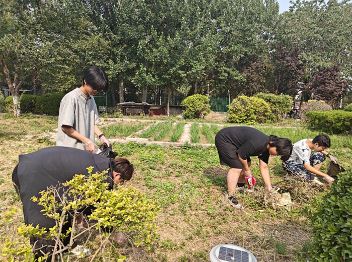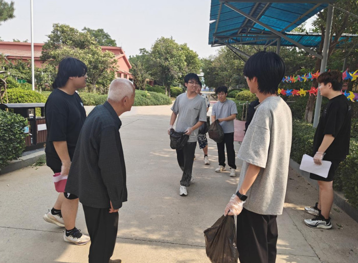 除陪护交流外,实践团还参与了养老中心内的劳动实践,协助清理院内种植区的杂草与落叶。在高温天气下,成员们戴上手套,手持工具,分组前往绿化带和菜地进行细致的除草清理工作。整个过程中,青年们动作利落、不怕脏累,赢得了工作人员的肯定。不少老人驻足观看,不时对这些年轻人竖起大拇指。劳作结束后,几位团员还主动将清理出的杂物统一打包,确保环境整洁。