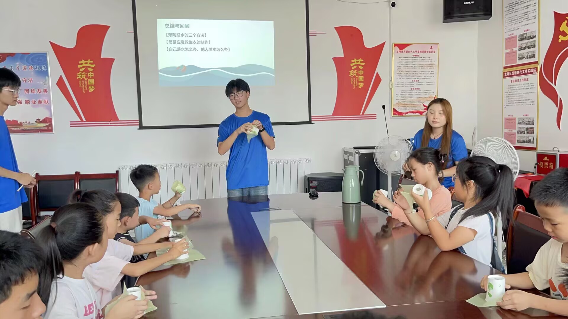 实践团成员先引导社区儿童沉浸式感受溺水状态,直观认知危险;再演示救生衣规范穿戴,拆解步骤、强调要点;同步开展应急自救知识讲解,从高效呼救技巧到基础自救动作,细致传授。过程中,着重强调“不下水施救、及时呼救”原则,还指导孩子们用毛巾、塑料瓶等常见物品,动手制作简易救生装备 。