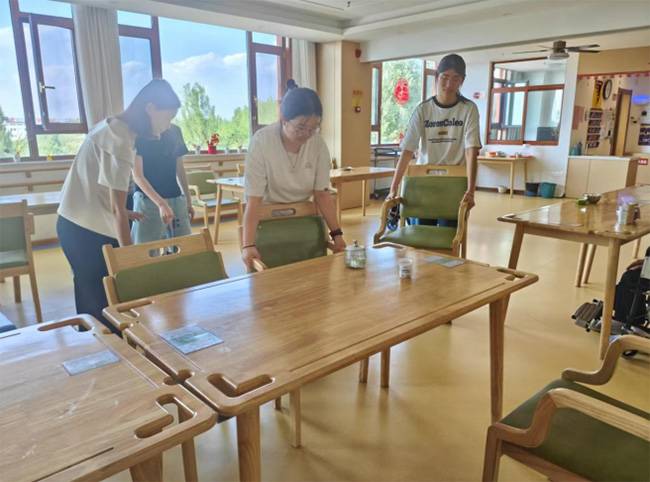 在养老中心的日子里,实践团成员积极参与日常服务。刚进入活动场地时,大家便协同整理桌椅,布置环境,为老人们营造整洁舒适的休息氛围。看似普通的细节,却体现出他们对服务工作的细致与耐心。