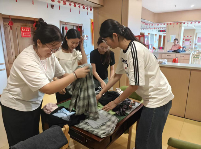 图为“智慧火花”实践团成员整理老人衣物