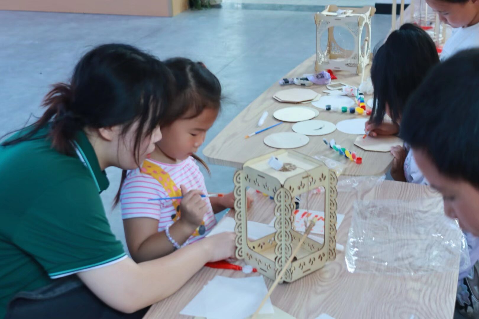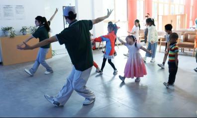 “创意彩灯”非遗体验活动中,李小伟带来了自贡彩灯的精美图片,结合图片向孩子们介绍:“这些彩灯最早是用来庆祝节日的,已经有上千年历史了。”随后,他分发彩纸、竹篾和胶水,指导孩子们制作简易彩灯。11岁的黄意国在灯纸上画出雪梨和花椒,完成后举着作品走到台前:“这是我们家乡的特产!”他的普通话虽然带着口音,但表达流畅,赢得了大家的掌声。宋可唯组织的《玛丽波尔卡》音乐律动活动则让现场气氛更加热烈,当《超级玛丽》的经典配乐响起,孩子们立刻欢呼起来,跟着节奏拍手、跳跃,有的还模仿游戏里的动作,欢快的笑声传遍整个活动室。