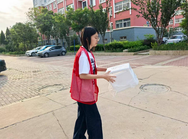 除了日常垃圾的处理,实践团成员还主动对社区环境进行了整理。在小区广场上,她双手抱着体积较大的泡沫包装盒,准备将其投放到可回收垃圾桶内。面对居民随手丢弃的废弃物,她并没有简单地进行搬运,而是逐一检查、分拣,确保每一类垃圾进入合适的处理渠道。她的行动吸引了路过居民的目光,大家纷纷停下脚步观看,甚至有居民主动询问垃圾分类的相关知识,现场氛围活跃而热烈。
