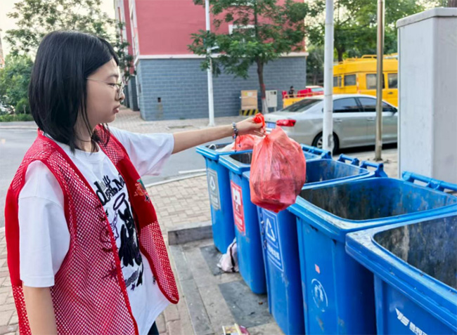 在社区的垃圾投放点,身穿红色志愿马甲的实践团成员正在认真地将生活垃圾按照分类要求投入相应的垃圾桶。她一手提着装有日常废弃物的袋子,仔细辨认垃圾桶标识后,才将其投放进去,确保垃圾分类投放准确无误。这一细节性的举动,不仅体现出个人的责任意识,也向周边居民传递了环保理念。