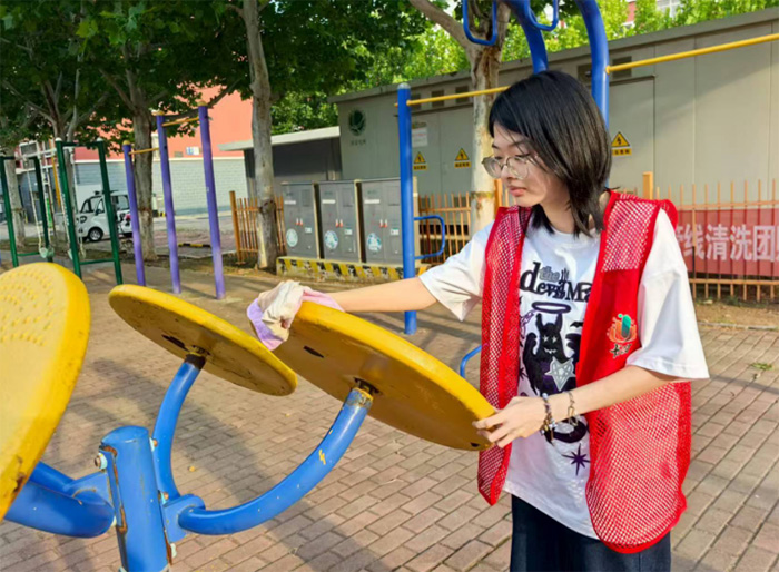 在开展垃圾分类的同时,实践团成员还走进社区健身区,对公共运动器械进行了擦拭与清洁。她用抹布细致地擦拭着器械的扶手与座椅,不放过任何一个容易积尘的角落。夏日傍晚时分,前来锻炼的居民看到干净整洁的运动设施,纷纷表示更加愿意参与锻炼,社区环境因此显得焕然一新。