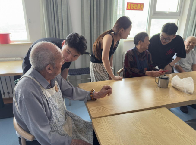在养老中心的公共活动室内,实践团成员与老人们促膝交谈,认真倾听他们的生活故事和心声,现场气氛温馨融洽。年轻人与长者之间的互动让原本安静的房间充满了笑声和温情,老人们的脸上也逐渐露出舒心的笑容。