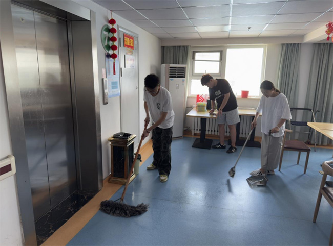 除精神陪伴外,实践团成员还积极投入到实际劳动中。他们走进老人们的房间,细心为卧室整理床铺,叠放整齐的被褥使居住环境更加舒适整洁。与此同时,另一部分成员拿起清洁工具,对走廊和活动区域进行全面打扫,确保环境干净明亮,为老人们创造出一个更加舒心的生活空间。