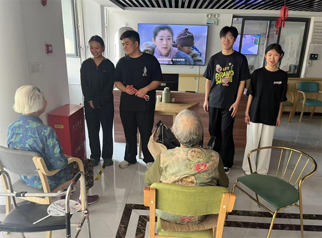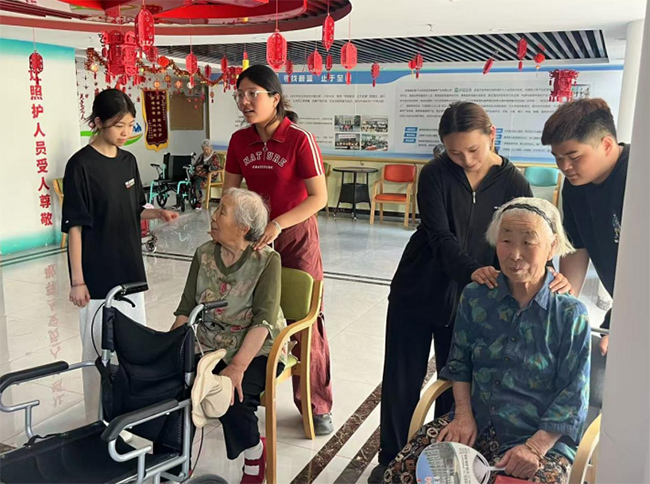 除了日常环境清洁,实践团成员还主动与老人们展开互动交流。在活动区域,几位老人围坐在椅子上,面带微笑地倾听着志愿者讲述趣事。成员们通过聊天、按摩、表演等多种形式,拉近与老人的距离。面对面谈心、肩膀上的一双手、一声问候,换来的是老人们眼中泛起的感动与笑意。一位坐在轮椅上的老人轻轻拍了拍志愿者的手,轻声说道:“谢谢你们,真贴心。”
