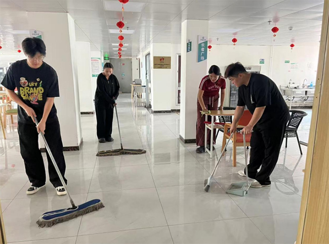 在炎炎夏日中,几位身穿统一服装的大学生正忙碌在养老院的各个角落。他们分工明确,有的手持拖把认真清洁走廊地面,有的用抹布仔细擦拭桌椅死角,力求为老人们打造一个更加整洁舒适的生活环境。清晨与黄昏之间,一张张年轻的面孔穿梭在长者身边,默默用行动传递关怀。