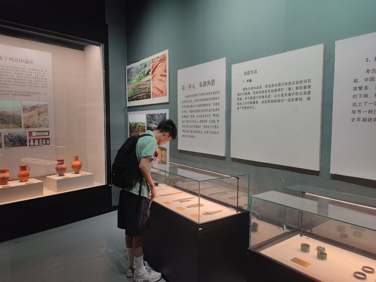 步入一楼展厅,“农耕渔猎”单元的陈列瞬间将时光拉回千年前的毕节大地。玻璃展柜中,红褐色陶罐静静伫立,虽釉色斑驳,却仍保留着盛水储粮的实用轮廓;磨制精细的石斧、石镰,刃部的光泽仿佛还残留着先民砍樵垦荒的温度。调研团成员俯身凑近展柜,指尖轻抵玻璃,目光在文物与展板间游移:“这些工具看似简陋,却是先辈们与自然博弈的‘武器’,藏着生存的智慧。”展板上,毕节先民的生活图景徐徐展开:从采集渔猎到定居农耕,从石器粗放到工具精制,独特的喀斯特地貌孕育了“水畔捕鱼、坡地垦田”的多元生产方式。讲解人员补充道:“毕节的农耕文明,是坚韧与灵动的结合——缺水就修渠,坡陡就垒田,这份对土地的执着,正是红色革命扎根的土壤。”成员们围绕展柜展开讨论:从石器的打磨工艺推测技术水平,从陶器的分布联想聚落形态。当看到“鸡公山遗址”的考古成果时,祖啸天同学感慨:“原来早在旧石器时代,毕节就有人类活动!先辈们战天斗地的基因,早就刻在这片土地里了。”