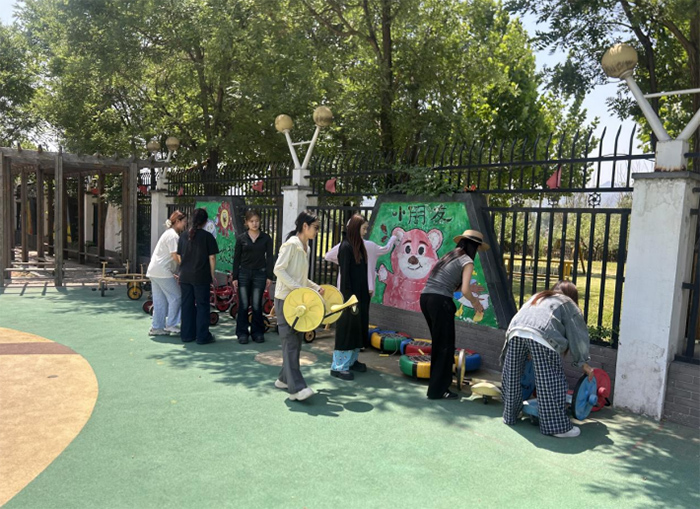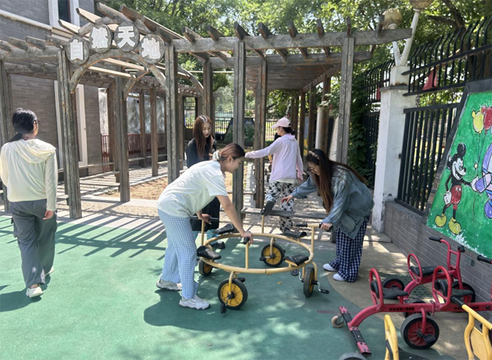 实践期间,实践团成员深入园区内外,协助教师完成日常环境整理、教学辅助及教具维护等多项工作。在户外区域,成员们分工协作,对幼儿常用玩具车、滑板等大型器械进行检查与清洁,确保设施安全可靠,为孩子们营造一个干净整洁的游戏环境。阳光透过木质长廊洒落在地面,成员们在“自然天地”区域认真摆放儿童三轮车的身影成为一道温馨的风景。
