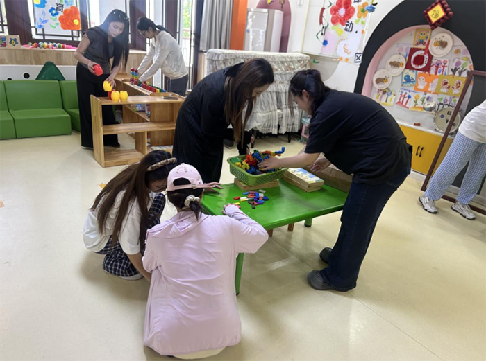 在室内活动区,成员们则以更为细致的态度投入工作。她们有的蹲在绿桌前清点积木、有的负责分类收纳,有的则重新摆放图书和教具架上的教玩具,整个教室井然有序。