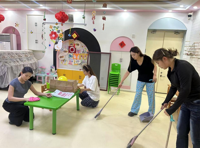 除了整理教具,环境清洁也是实践重点之一。成员们在完成分类归置后,手持扫帚和拖把,对教室的每一寸地面进行认真清扫。不放过任何一个角落,是她们对这份实践经历的认真回应。另一组成员则专注于擦拭桌椅、消毒物品,用行动守护幼儿园的每一份整洁与安全。