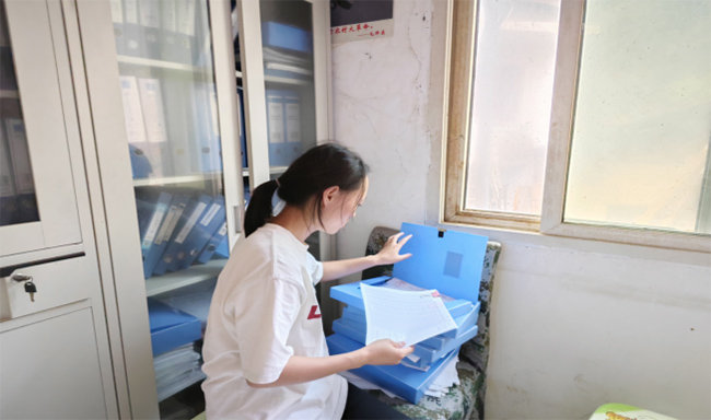 在实践期间,团队成员承担了多项基础工作。一早来到政府办公室,她便开始以同事指导的方式整理堆积如山的资料。面对种类繁杂的文件,认真分类,将重要政策文件、民生资料等分别“分类-编号-装订-入柜”的标准化流程,确保资料存放有序,方便后续查阅使用。