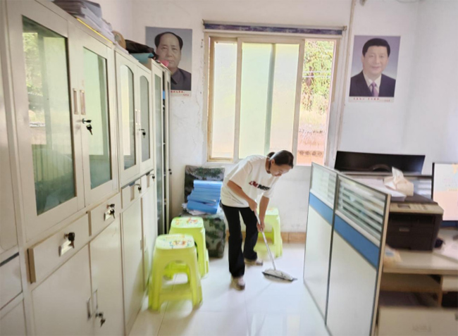 打扫卫生的工作虽然琐碎,但也做得一丝不苟。她会将办公室的地面清扫得干干净净,擦拭桌椅,为工作人员创造干净整洁的办公环境。