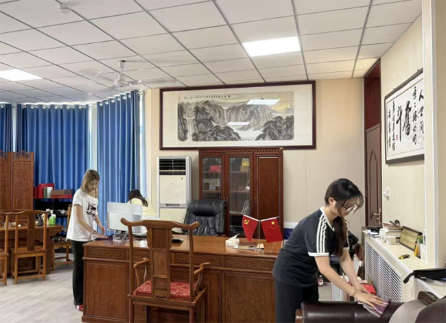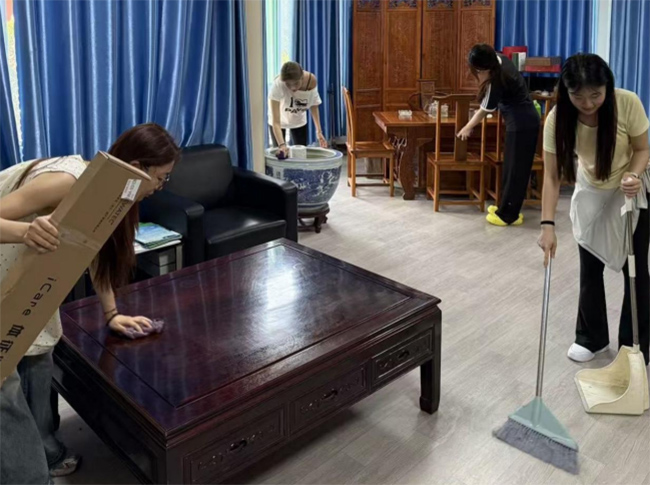 除了与老人互动,实践团成员还积极参与养老中心的环境整理工作。他们走进办公室与公共区域,擦拭桌椅、清洁地面、整理书籍与文件,用实际行动改善场所的整洁度。无论是抹布擦拭,还是扫帚清扫,志愿者们都投入认真,力求为老人和工作人员创造更舒适的环境。