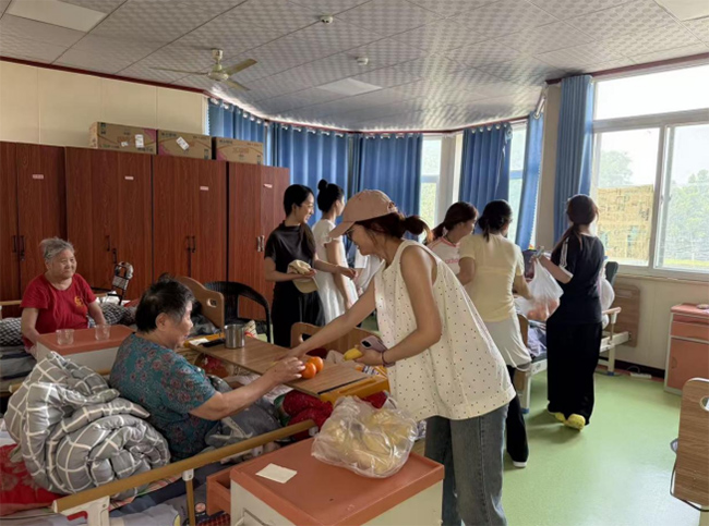 在活动过程中,志愿者们首先分组进入老人居住的病房,与长者们面对面交谈,仔细倾听他们的日常生活和身体状况,耐心回应提出的小需求。老人们在陪伴下露出笑容,纷纷与实践团成员分享生活点滴。志愿者们还贴心地递上新鲜水果,为老人带去慰问与祝福。
