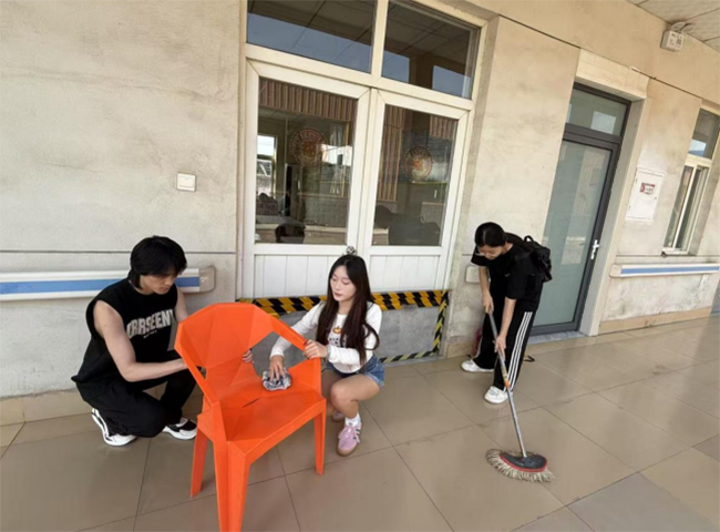 除了陪伴交流,实践团成员还承担起清洁整理任务。在户外走廊,有的成员拿起抹布认真擦拭椅子,有的成员挥动拖把清扫地面,将环境打理得井然有序。这样的分工协作不仅让养老院环境更加整洁舒适,也展现了青年学生踏实肯干的精神面貌。