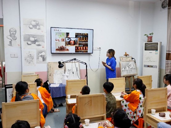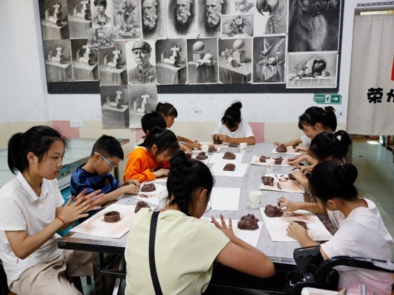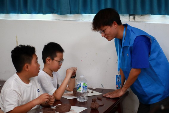 图为实践队成员与荣州书画培训学校新城分校的小朋友们共同完成土陶作品。杨欣霖供图