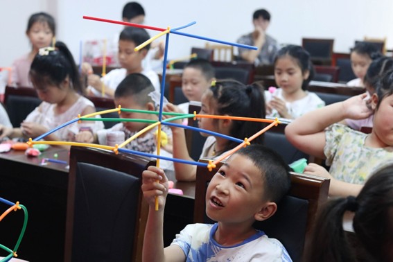 图为实践队成员和小朋友们在课堂上专注地玩吸管积木。杨欣霖 供图