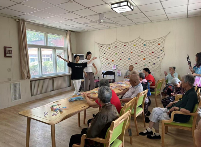 除日常陪伴外,实践团还策划了丰富的文娱环节。在养老院的公共活动室内,他们与老人们共同完成手工制作,桌面上摆放的彩色小饰品为房间增添了活力。老人们积极参与其中,不仅锻炼了手脑协调能力,也在互动中感受到来自年轻人的陪伴与关心。
