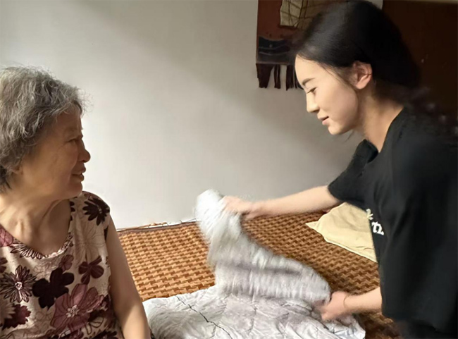 在与老人的互动中,实践团成员注重细节关怀。一名成员耐心地为老人整理床铺,老人脸上露出笑容,场景温馨而感人。在另一处活动室里,成员们与老人面对面交流,带领大家做起简单的肢体动作,现场不时传来阵阵笑声与掌声,气氛活跃而融洽。