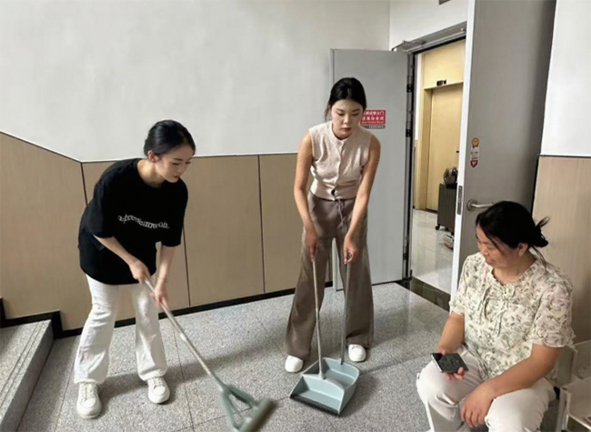 在日常服务中,实践团成员主动承担起清洁任务,有的拿起扫帚和簸箕认真打扫走廊,有的帮助护理人员减轻工作负担,确保老人们居住的环境整洁舒适。与此同时,他们还细心地为工作人员按摩肩颈,表达对长期辛勤付出的理解与关心。