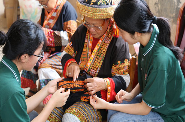 图为瑶族绣娘为团队成员讲解瑶族纹样。张君供图